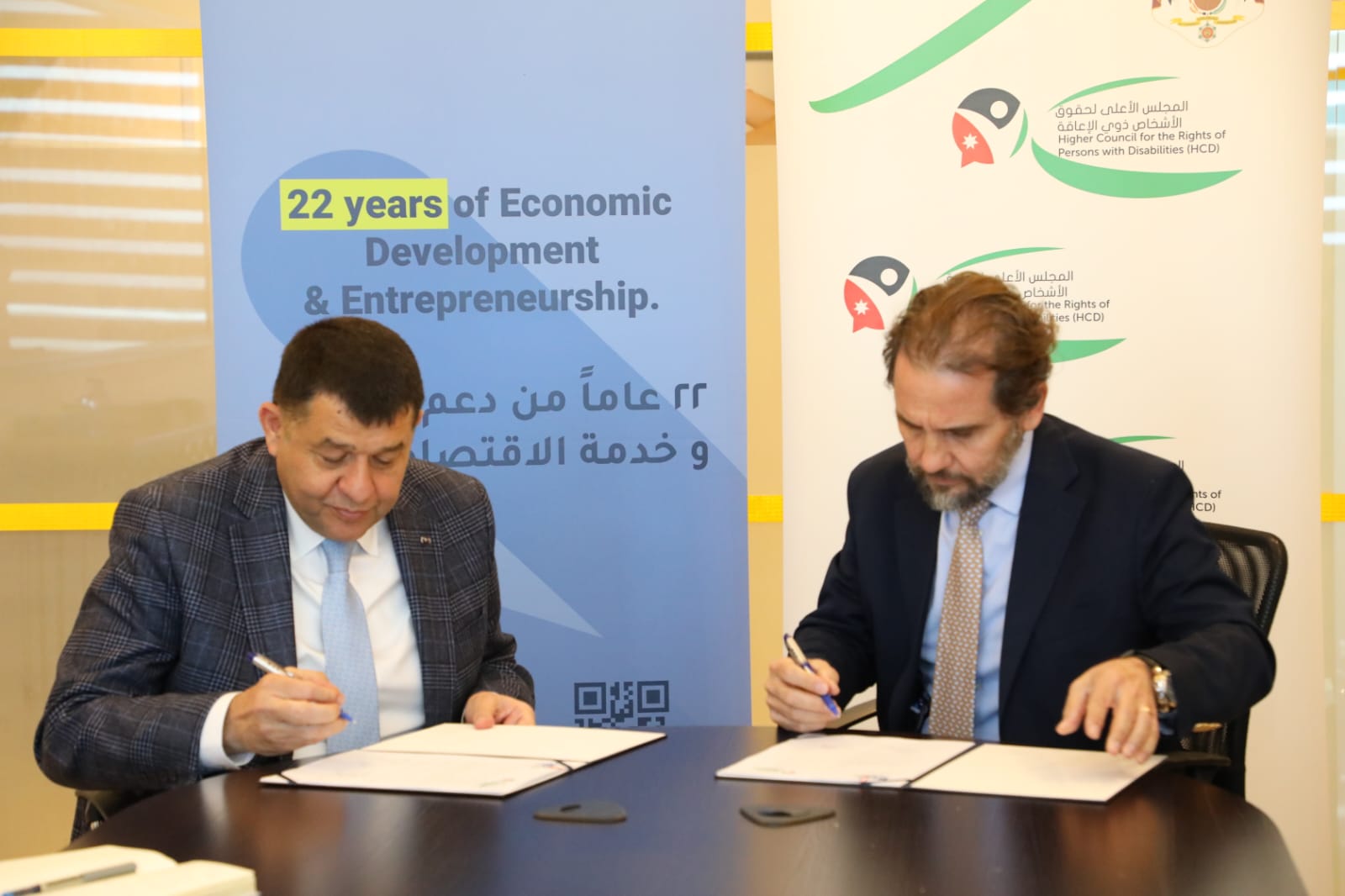 وقع سمو الأمير مرعد بن رعد كبير الأمناء رئيس المجلس الأعلى لحقوق الأشخاص ذوي الإعاقة ووزير العمل السابق ومؤسس مركز تطوير الأعمال نايف استيتية مذكرة تفاهم تهدف إلى تعزيز التمكين الاقتصادي للأشخاص ذوي الإعاقة وزيادة مشاركتهم في النشاطات الاقتصادية وريادة الأعمال.