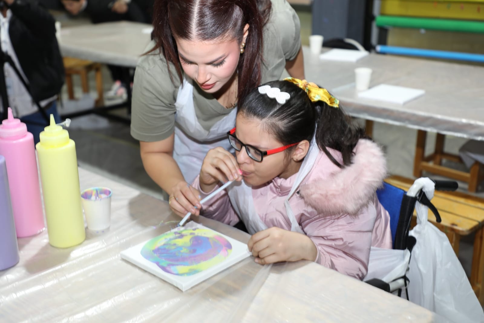 وشارك الأطفال ضمن الفعالية في ورشة فنية دامجـة في استديو الفن، استخدموا خلالها ألوانا وأساليب متعددة لرسم لوحة تعكس تنوع المهارات.